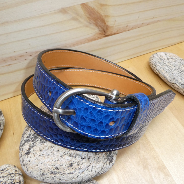 Ceinture artisanale en peausserie croco bleu verni doublé cuir tannage végétal naturel non teinté.