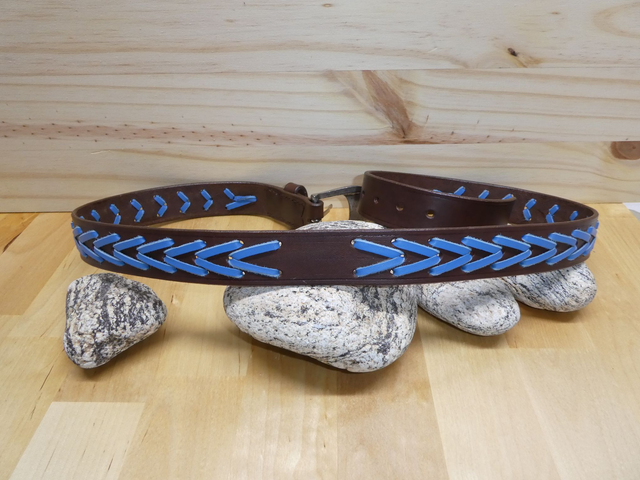 Ceinture artisanale en cuir Havane avec tressages en cuir bleu ciel cousu havane.