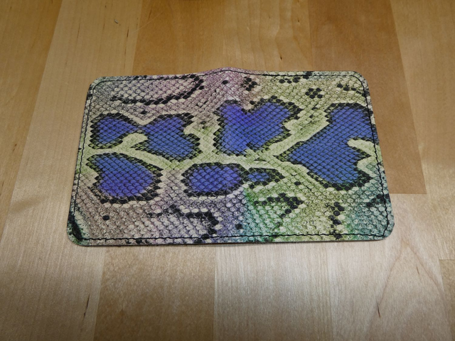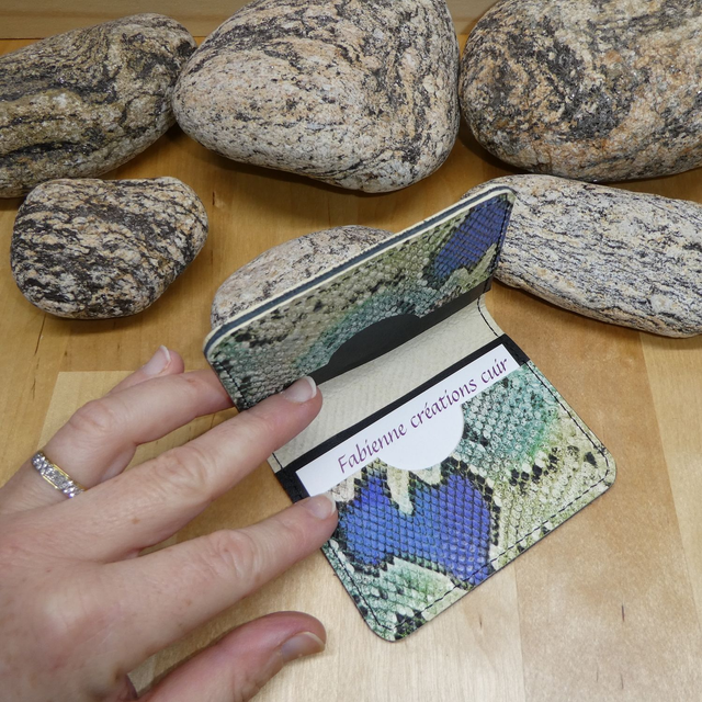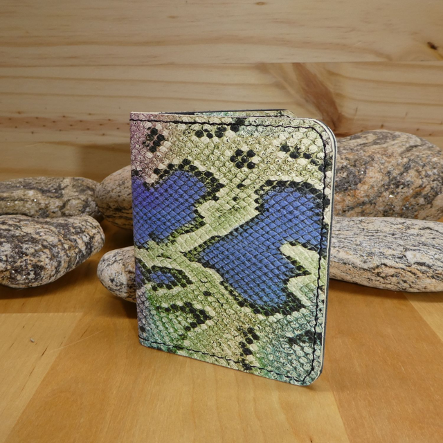 Porte carte réalisé en cuir vachette impression serpent coloré pour la couverture.